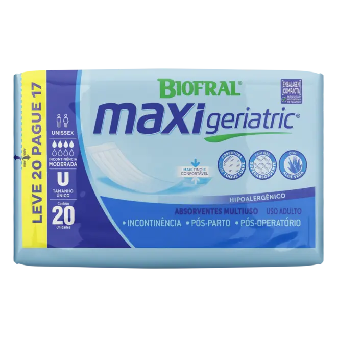 É um absorvente descartável multiuso projetado para uso geriátrico ou para adultos. O produto é da linha Maxi Geriatric da marca Biofral e é unissex.