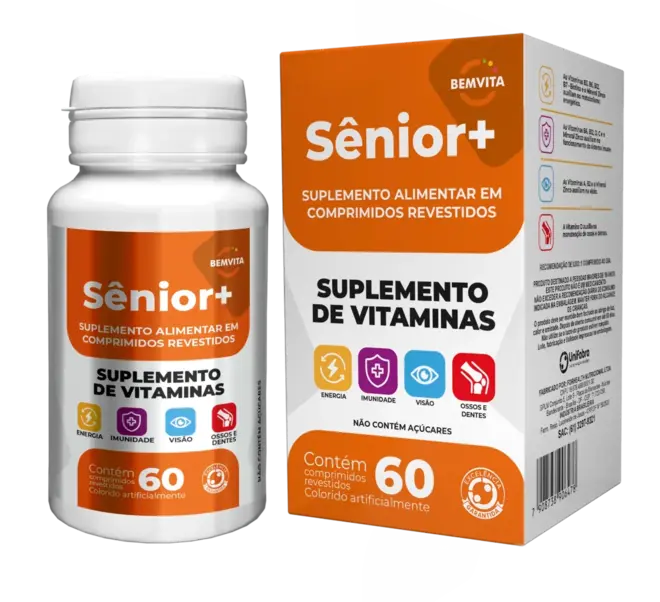 Bem Vita Senior é um suplemento alimentar desenvolvido especialmente para atender às necessidades nutricionais de pessoas acima de 50 anos. Sua fórmula contém vitaminas e minerais essenciais para o bom funcionamento do organismo, com foco em saúde óssea, imunidade, energia e cognição.