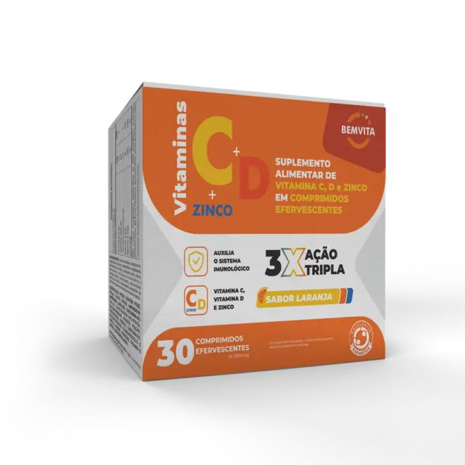 Bem Vita Vitamina C D + Zinco 30 comprimidos efervescentes: fortalece a imunidade e ossos, com fácil consumo e sabor agradável no dia a dia.