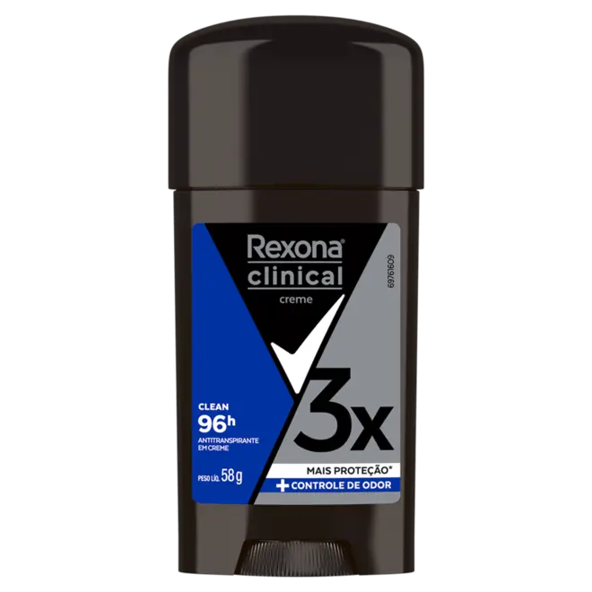 Rexona Men Clinical Clean é um desodorante antitranspirante em creme, que oferece três vezes mais proteção que um antitranspirante comum, além de proporcionar frescor, conforto e segurança.