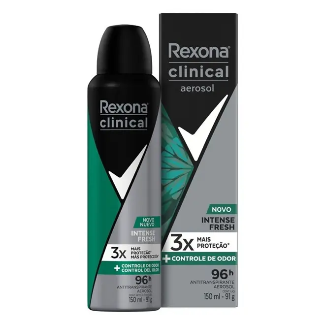 O Rexona Clinical Intense Fresh é um desodorante aerossol masculino que oferece três vezes mais proteção que um antitranspirante comum, proporcionando frescor, conforto e segurança e mantendo sua pele seca ao longo do dia.