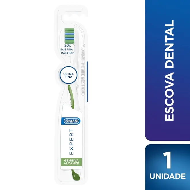 O que é: Escova Dental Oral-B Expert Gengiva Alcance possui cerdas 20 vezes mais finas e uma cabeça compacta, ajudando a limpar entre os dentes e as gengivas.