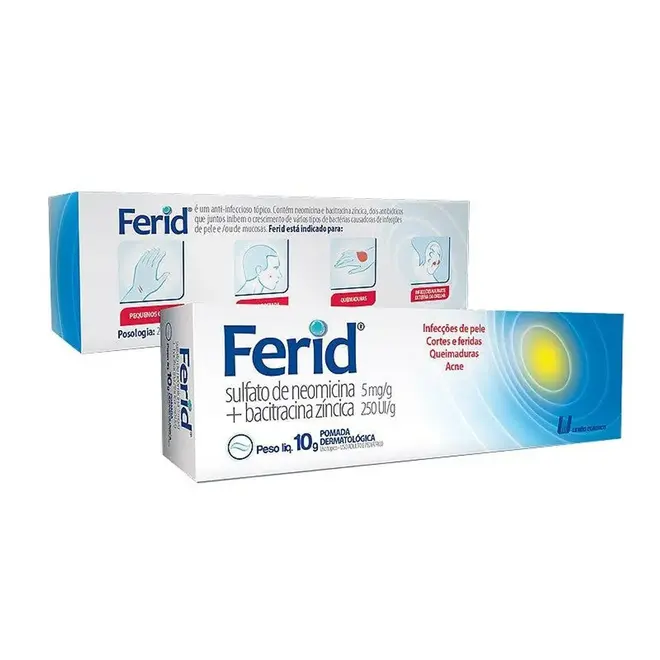Ferid pomada dermatológica 10 g combate infecções bacterianas da pele com dupla ação em neomicina + bacitracina zíncica para cuidados eficazes.