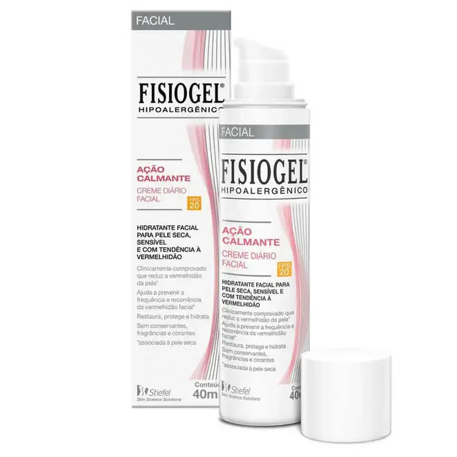 Creme Facial Fisiogel A.I. Ação Calmante FPS20 40ml: hidratação intensa, alívio da vermelhidão e proteção solar para peles secas e sensíveis.