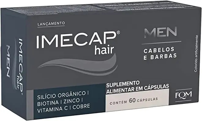 Imecap Hair Men é um suplemento alimentar em cápsulas especialmente desenvolvido para manutenção dos cabelos e barbas. Composto de silício orgânico, cobre, zinco, biotina e vitamina C, ele está disponível em embalagem com 60 cápsulas.