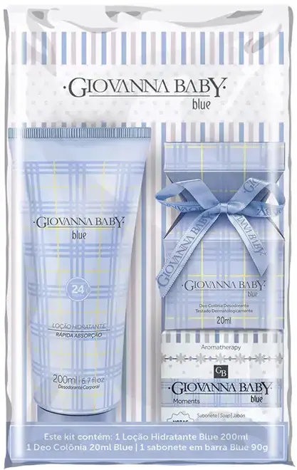 É um conjunto presenteável ou kit de cuidados corporais da linha clássica "Blue" da marca Giovanna Baby. Os produtos possuem a fragrância característica da linha, que combina notas florais de jasmim, rosa e ylang-ylang com um fundo de musk e vanilla.