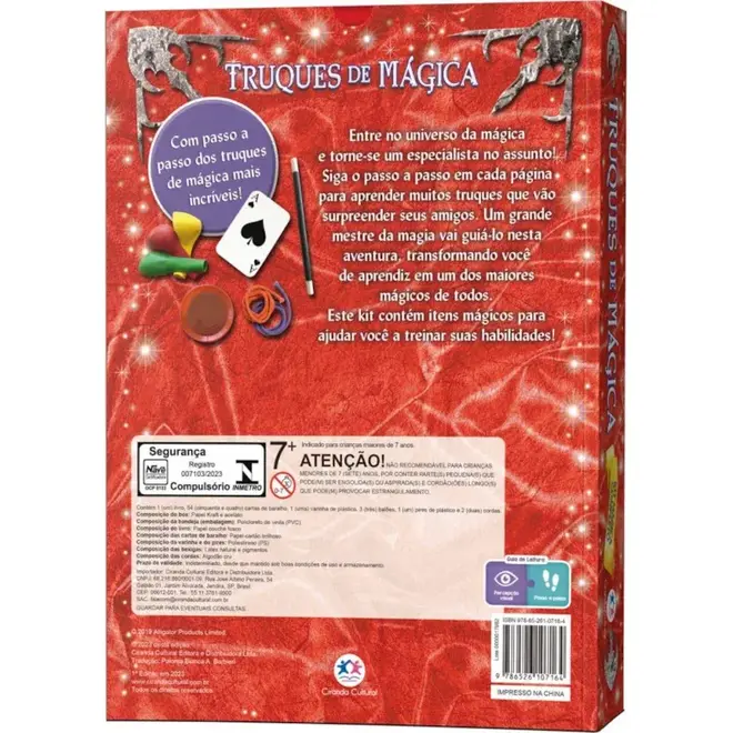 O kit acompanha um livro ilustrado com instruções passo a passo e diversos acessórios para a criança praticar os truques: