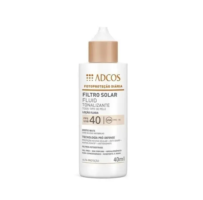 Protetor Solar Adcos Fluido Tonalizante Beige FPS 40 40ml: alta proteção com cobertura natural, toque seco e ação antioxidante. Ideal para todos os tipos de pele.