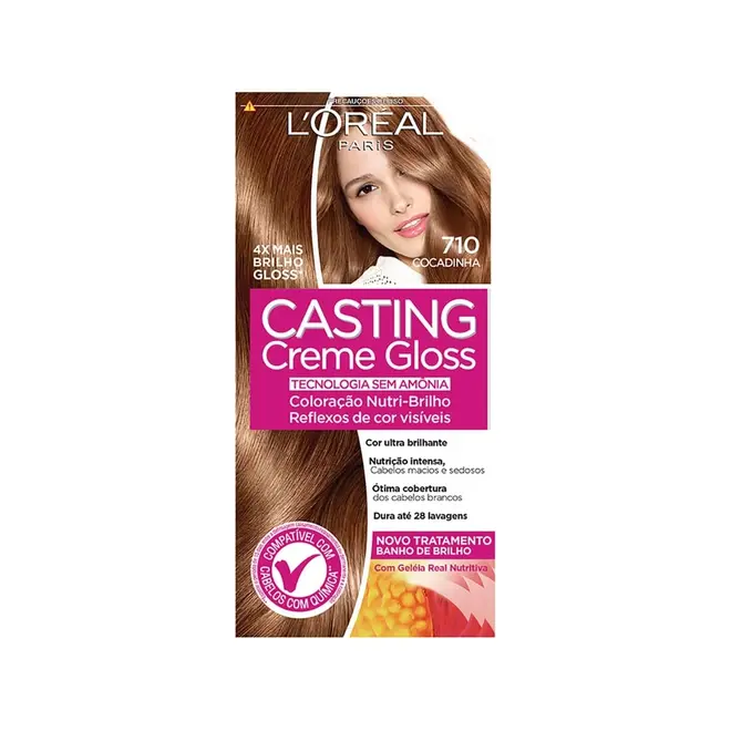 DESCRIÇÃO DO PRODUTO: O que é: Casting Creme Gloss é a coloração sem amônia de L'Óreal Paris que garante 4 vezes mais brilho gloss para os fios. Casting Creme Gloss pode ser usado até em cabelos com química. Para que serve: Durante a coloração, sua exclusiva fórmula reforça a fibra capilar, deixando seus fios mais macios com um toque aveludado, sem ressecamento. Modo de usar: Misture o creme colorante com o revelador e misture bem. Aplique a coloração por todo o cabelo, indo das raiz até as pontas. Use um pincel para espalhar bem o produto. Deixe o produto agir por aproximadamente 20 minutos, de acordo com as instruções da embalagem. Enxágue o cabelo em água corrente para retirar todo o produto. Com os cabelos úmidos, aplique o condicionador de tratamento Nutri-Brilho, para deixar os fios macios e brilhosos.