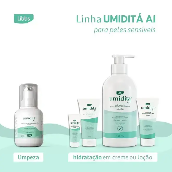 O Umiditá AI é um sabonete líquido cremoso para uso facial e corporal indicado para a limpeza da pele sensível, sensibilizada e com dermatite atópica (DA). Sua fórmula limpa suavemente a pele atópica sem agredir, auxiliando no alívio de irritações e coceiras e acalmando a pele.