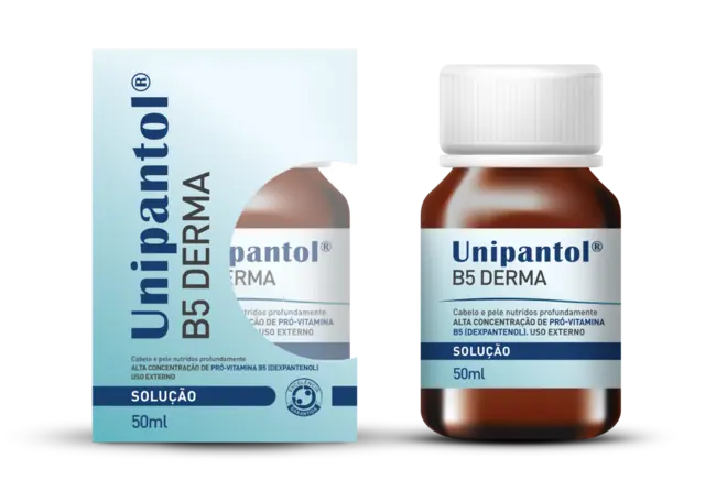 Unipantol Derma Solução 50ml. Fórmula líquida com Pró-Vitamina B5. Ideal para hidratação e regeneração profunda de pele, cabelo e couro cabeludo.
