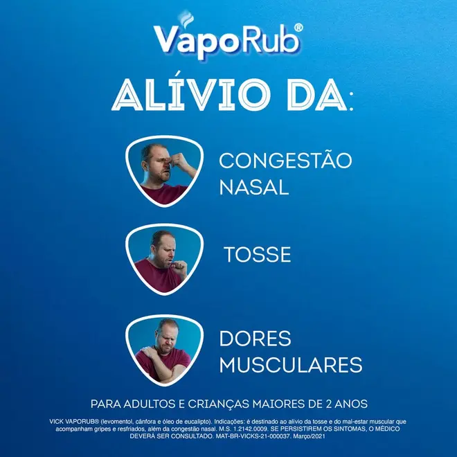 Passe uma camada fina até 3 vezes ao dia. No peito para acalmar a tosse. No pescoço para que, ao inalar seus vapores medicinais, eles aliviem a congestão nasal e facilitema respiração. Nas costas para que a sensação de calor oferecida por Vick Vaporub ajude a acalmar o mal-estar muscular que acompanha gripes e resfriados. Como inalante: coloque 2 colheres das de chá de Vick Vaporub em uma vasilha com meio litro de água quente, não fervendo, e inale por 10 a 15 minutos. Repita conforme necessário.