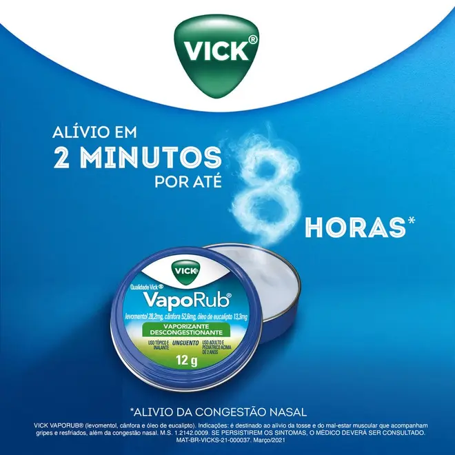 Vick Vaporub é um unguento para ser passado no peito, pescoço ou costas ou pode ser adicionado a água quente. O medicamento libera três ingredientes ativos, os quais são inalados pelo paciente para proporcionar alívio da tosse e do mal-estar muscular que acompanham as gripes e resfriados, bem como alívio da congestão nasal (entupimento do nariz ocasionado por gripes, resfriados ou outros fatores como rinite alérgica). Ao passar, ou fazer inalação com Vick Vaporub, os vapores dos óleos essenciais que o compõem , agem nos receptores das vias aéreas superiores, promovendo o alívio da descongestão nasal e da tosse. A massagem realizada ao passar o medicamento nas costas aquece a região, promovendo o alívio do desconforto muscular. O efeito geral de Vick Vaporub é sentido após 5 minutos da aplicação. É destinado ao alívio da tosse e do mal-estar muscular que acompanham gripes e resfriados, além da congestão nasal.